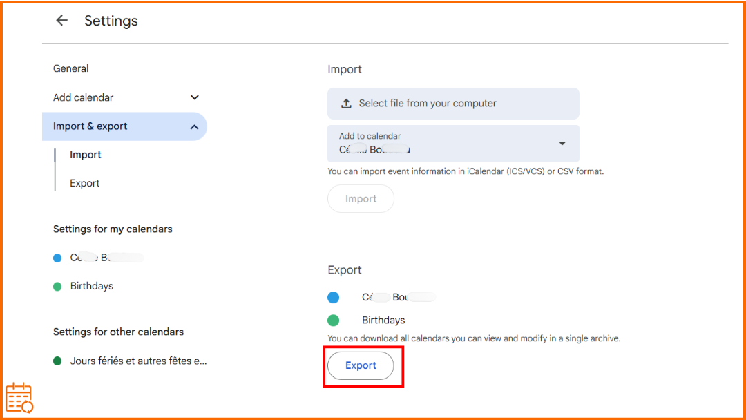 - Select the calendar you want to export and click Export calendar. Google downloads a .zip file containing one or more .ics files (one per calendar).