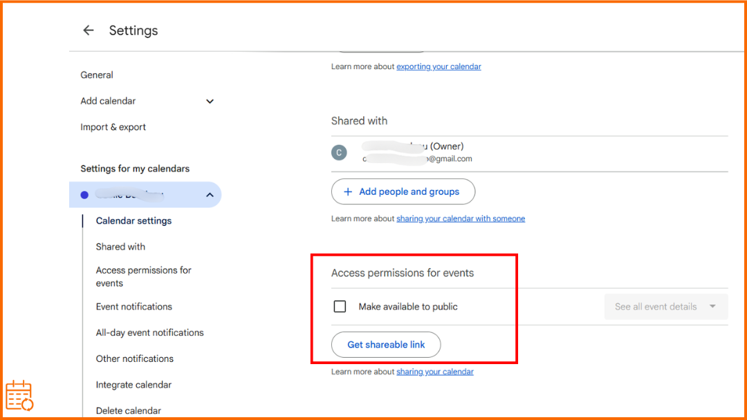 ⚠️ Anyone with the link will be able to access your calendar based on the selected permissions