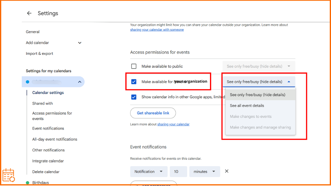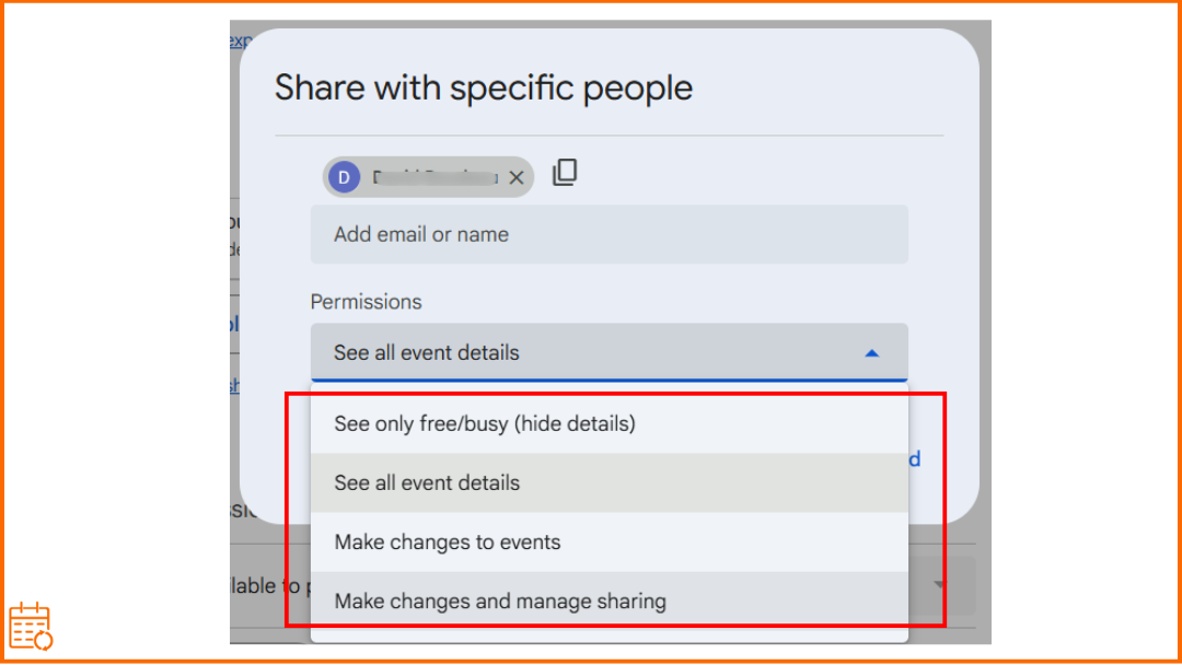 1. “See only free/busy (hide details)”: Users can only see your availability, not event details.