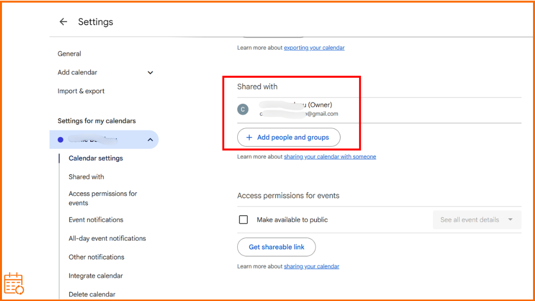 🔹 Case 1 — The user uses Google Calendar (recommended): Add their Gmail address in “Settings and sharing.” They will receive an invitation.